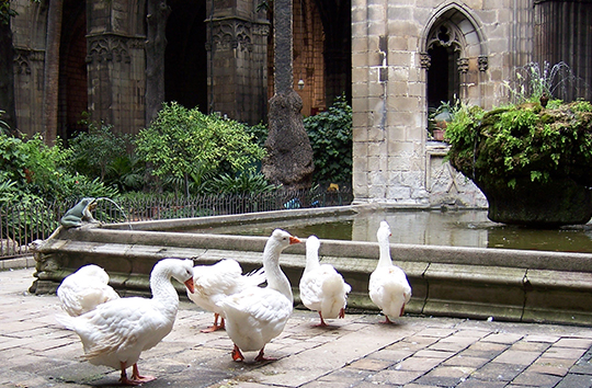 Dedicated to the Holy Cross and Saint Eulalia, co-patron saint of the city, the Barcelona Cathedral have various points of interest, including the cloister. In there, there is a garden with palm trees, magnolias, an orange tree, a fountain of the mid-fifteenth century (place of the traditional "ou com balla” (dancing egg) of Corpus Christi) and a pond. Around this last spot is where the thirteen white geese of the Cathedral wander freely. Legend has it that Santa Eulalia's body rests in the crypt of that place, because she was convicted for refusing to renounce her Christian faith. Thus, the number of geese coincides with the thirteen tortures that were applied to her and with her age. However, it is also said that during the construction of the cathedral the guardian of the reform had some geese, which prevented the thieves from stealing the place. Since then, the geese have freedom to roam.